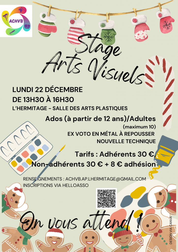 L’ACHVB organise cette année un stage de Noël pour enfants/ados/adultes (à partir de 8 ans) d’arts visuels qui aura lieu le lundi 22 décembre 2025 de 13h30 à 16h30 à la salle de dessin de la Commanderie à L’Hermitage. Ce stage mettra Noël à l’honneur. C’est l’occasion de découvrir de nouvelles techniques et de préparer de jolies décorations de Noël pour vos fêtes de fin d’année.